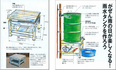 やさい畑(家の光協会)の連載「菜園DIY講座」で描いたイラストです。 2012年夏号 ドラム缶で作る雨水タンク(とそれを載せる台)
